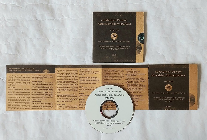 Hazırlayan: Nüvis Beşeri Araştırmalar ve Yayıncılık Ltd.Şti. Yayıncı: Milli Kütüphane Basım yeri: Ankara Basım Tarihi: 2001 Dil: Türkçe Ebat: 13x13 Açıklama: "Türkiye Makaleler Bibliyografyası’nın yayınlanmaya başladığı 1952 yılından önce yayınlanan makaleler ile 1952'den 1999 yılına kadar geçen sürede yayınlanmış, ancak bibliyografyada yer almamış makaleler ve 1952-1999 yılları arasında yayınlanan Türkiye Makaleler Bibliyografya’sında yer alan makale künyelerini kapsayan Cumhuriyet Dönemi Makaleler Bibliyografyası CD olarak yayınlanarak araştırmacıların hizmetine sunulmuştur. Milli Kütüphane Başkanlığı, [2002]"