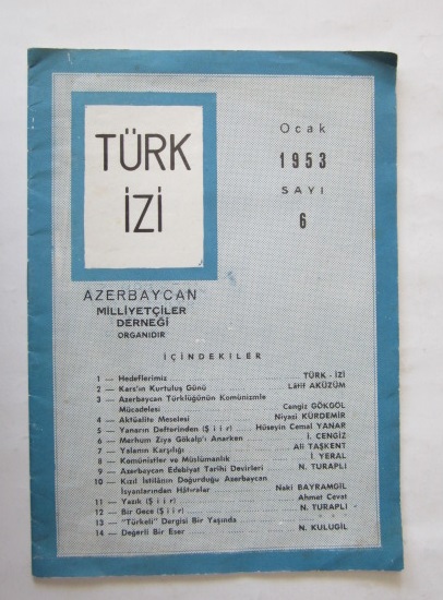Yazar: Cengiz Gökgöl (Neşriyat Müdürü) Yayıncı: Azerbaycan Milliyetçiler Derneği Basım yeri: Ankara Basım Tarihi: 1953 Dil: Türkçe Sayfa Sayısı: 16 s. Ebat: 16x23 Açıklama: Orijinal karton kapağında.