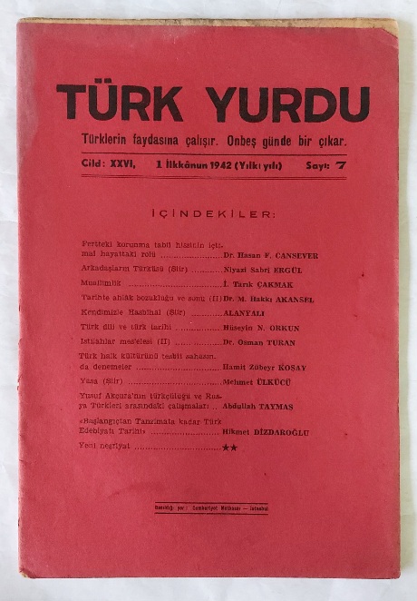 Yazar: Hasan Ferid Cansever (Sahibi ve Müdürü) Yayıncı: Türk Ocakları Basım yeri: Ankara Basım Tarihi: 1942 Dil: Türkçe Sayfa Sayısı: 197-228 arası Ebat: 16x24 Açıklama: Orijinal karton kapağında.