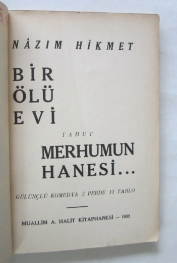 Yazar: Nazım Hikmet Yayıncı: Muallim A. Halit Kitaphanesi Basım yeri: İstanbul Basım Tarihi: 1932 Dil: Türkçe Sayfa Sayısı: 95 s. Ebat: 3x19 Açıklama: Orijinal karton kapağında.