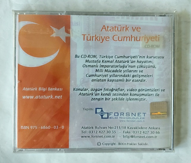 Yayıncı: Forsnet Bilgi Teknolojileri Basım yeri: [Ankara] Basım Tarihi: b.t.y. Dil: Türkçe Ebat: 14x12 Açıklama: Bu CD-ROM, Türkiye Cumhuriyeti'nin kurucusu Mustafa Kemal Atatürk'ün hayatını, Osmanlı İmparatorluğu'nun çöküşünü, Milli Mücadele Yıllarını ve Cumhuriyet yıllarındaki gelişmeleri analatan kapsamlı bir eserdir. Konular, özgün fotoğraflar, video görüntüleri ve Atatürk'ün kendi sesinden konuşmaları ile zengin bir şekilde işlenmiştir. (Arka kapaktan)