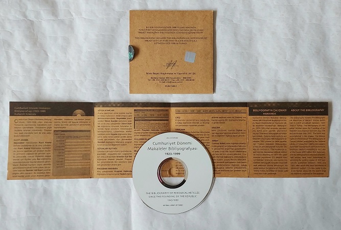 Hazırlayan: Nüvis Beşeri Araştırmalar ve Yayıncılık Ltd.Şti. Yayıncı: Milli Kütüphane Basım yeri: Ankara Basım Tarihi: 2001 Dil: Türkçe Ebat: 13x13 Açıklama: "Türkiye Makaleler Bibliyografyası’nın yayınlanmaya başladığı 1952 yılından önce yayınlanan makaleler ile 1952'den 1999 yılına kadar geçen sürede yayınlanmış, ancak bibliyografyada yer almamış makaleler ve 1952-1999 yılları arasında yayınlanan Türkiye Makaleler Bibliyografya’sında yer alan makale künyelerini kapsayan Cumhuriyet Dönemi Makaleler Bibliyografyası CD olarak yayınlanarak araştırmacıların hizmetine sunulmuştur. Milli Kütüphane Başkanlığı, [2002]"
