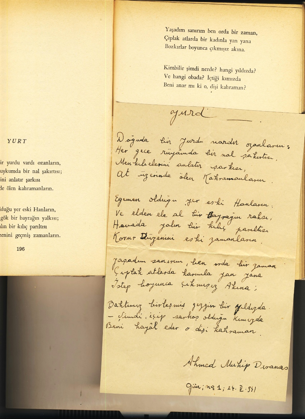 Ayrıca s.196'daki "Yurt" şiirinin bir elyazısı kopyası Ahmed Muhip Dıranas imzasıyla yapıştırılmış.