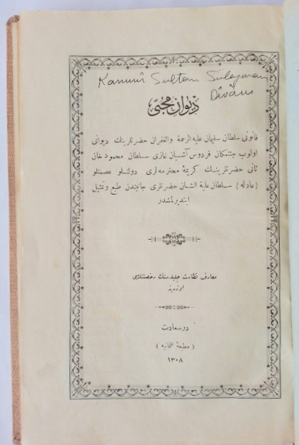 "Kanuni Sultan Süleyman Aleyh-er-rahmete Vel-gufran Hazretlerinin Divanı Olup Cennetmekan Firdevs-i Aşiyan Gazi Sultan Mahmud Han-ı Sani Hazretlerinin Kerime-i Muhteremeleri Devletlü İsmetlü ADİLE Sultan Aleyhü'ş-Şan Hazretleri Canibinden Tab' ve Teşmil İdilmiştir."