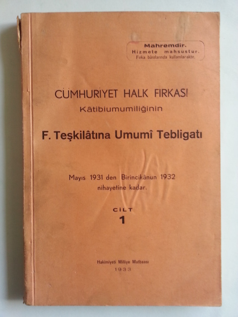 Cümhuriyet Halk Fırkası Katibiumumiliğinin F. Teşkilatına Umumi Tebligatı, Mayıs 1931 den Birincikanun 1932 Nihayetine Kadar, Cilt 1