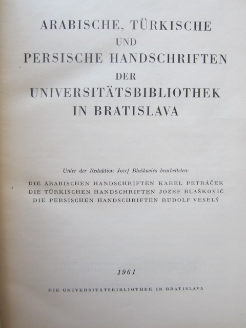 Bratislava Üniversitesi Kütüphanesinde bulunan Arapça, Türkçe ve Farsça el yazmaları kataloğu.