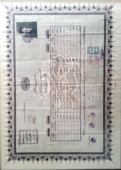 Mehmet Efendi oğlu Hüseyin Fahrettin Efendi'nin Fen kısmından, Alüyü'l Ala ile mezuniyetini tasdik eden, fotoğraflı, mühürlü, pullu diploma.