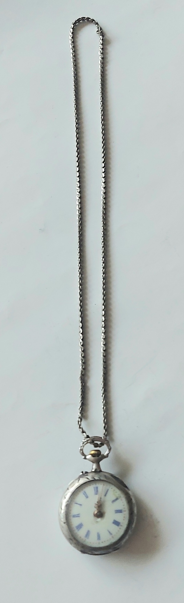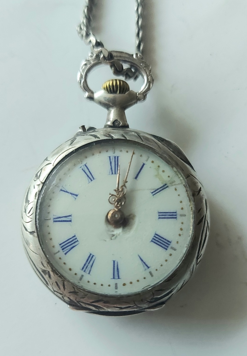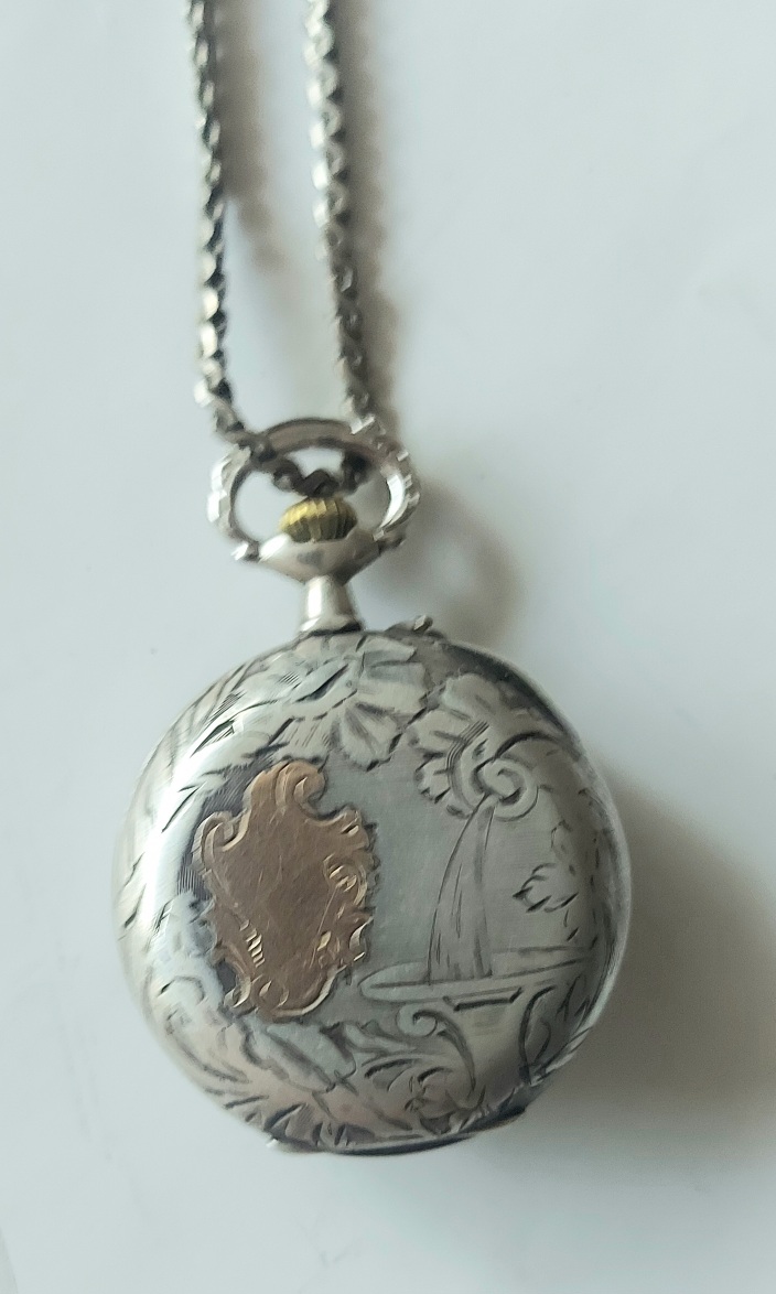 1910 yapım, gümüş, arkada isimlik yazma kısmı Altın kakma, mine kadran, İsviçre mekanizma, Alma malı kurmalı Zenne saat.
