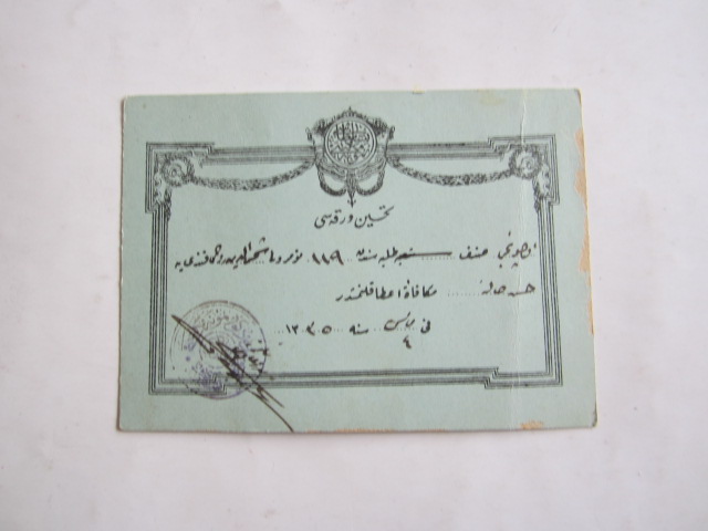 EFEMERA: TAHSİN Varakası Numune Mekatib-i Sultanisi, 3. Sınıf 119 Numerolu Şemseddin Vahid Efendi