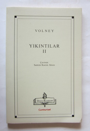 Yazar: Volney Çevirmen: Samim Kazım Akses Yayıncı: Cumhuriyet Basım yeri: İstanbul Basım Tarihi: 1999 Dil: Türkçe Sayfa Sayısı: 112 s. Ebat: 12x18 Açıklama: Orijinal karton kapağında.