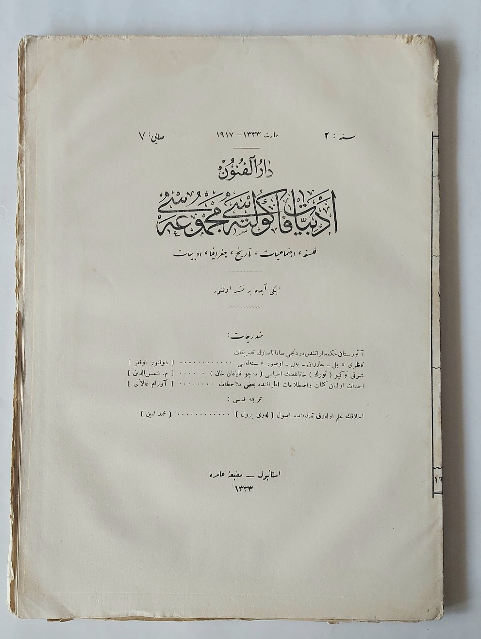 DARÜLFUNUN EDEBİYAT FAKÜLTESİ MECMUASI Felsefe, İctimaiyat, Tarih, Coğrafya, Edebiyat / İki Ayda Bir Neşrolunur, Teşrinisani 1333 / 1917, Sene: 2, Sayı: 7