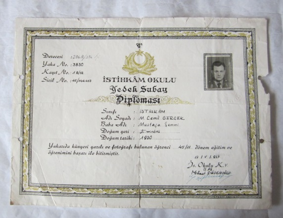 DİPLOMA: İstihkam Okulu Yedek Subay Diploması 17.5.1957- M. Cemil Gerçek'e Ait