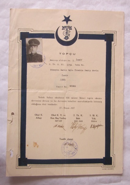 DİPLOMA: Topçu Yedek Subay Okulu İbrahim Necip Derin'e Ait 27 Nisan 1937