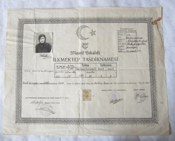 TASDİKNAME: T. C. Maarif Vekaleti İlkmektep Tasdiknamesi Rabia Hanım'a Ait 19.7.1929